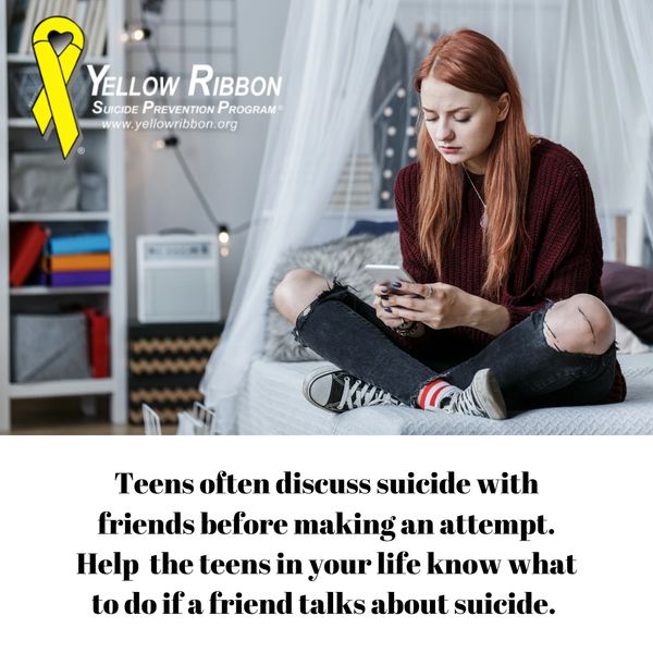 It is not uncommon for teens to think about suicide. Every year 1 in 5 teens seriously considers suicide and youth will most often seek help from their peers. It is imperative that youth are provided the tools to recognize other youth who may be at risk for suicide and the knowledge of how to respond if they are concerned. Studies have shown that youth peer training is an effective practice for education for youth. Designated a National Best Practice program, Yellow Ribbon utilizes a unique community-based model that increases the competence and confidence of youth to recognize and respond to suicidal individuals. Modified to be age and culturally appropriate, the curriculum follows the recognized safe messaging prevention practices.