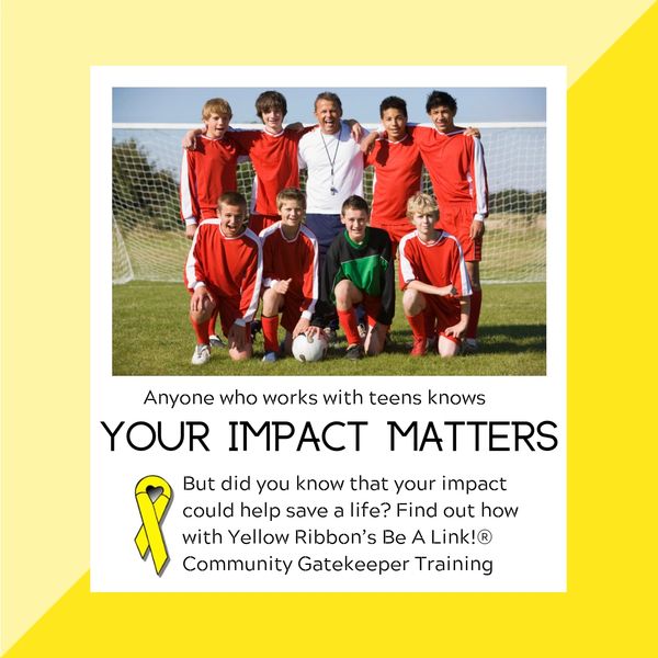 Yellow Ribbon’s Be A Link!® Community Gatekeeper Training is a community friendly, peer-based, non-clinical training. It teaches simple, effective tools of help between those in need and help resources. It emphasizes the important role parents, school personnel and other trusted adults can play in helping at-risk young people. This core model is appropriate for any adults, professional and non-professional. Yellow Ribbon has feedback that shows that trusted adults such as school bus drivers, coaches, custodians and scout leaders have been instrumental in helping save lives after receiving the training.